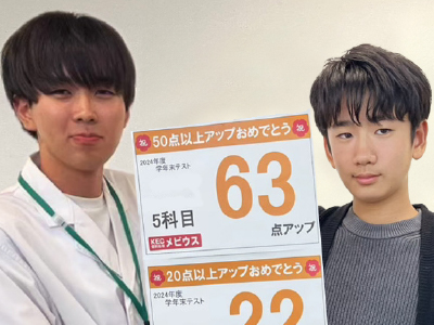 「定期テスト」の得点の大幅アップ、KEC個別指導メビウス 枚方本校にお任せください。KEC個別指導メビウス枚方本校では、毎回の定期テストで、成績大幅アップ(中には5教科で100点以上のアップの受講生も…)を実現しています。それが、なぜできるかは、「枚方イチ”ホメ”が多い塾」だからです。