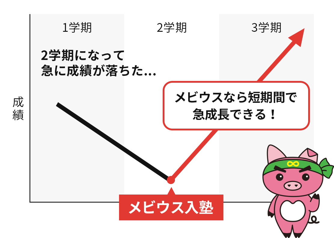 メビウスでは、メビウスに通っている中学生はすべて公立の中学生。公立の中学生に特化しているため公立中学の定期テストに非常に強く、一人ひとりの成績と向き合い、これから勉強をはじめる生徒の成績を伸ばします。