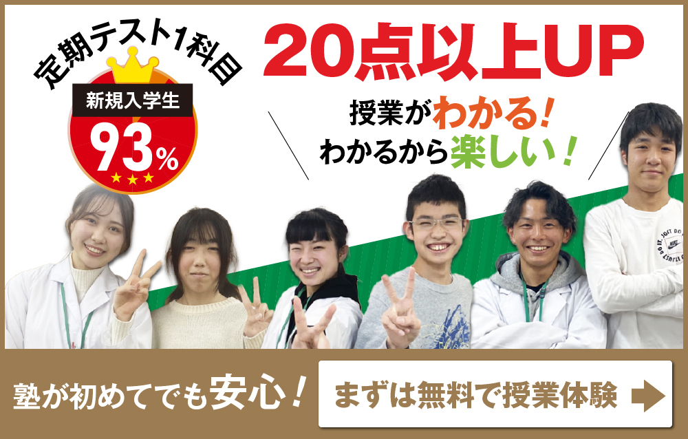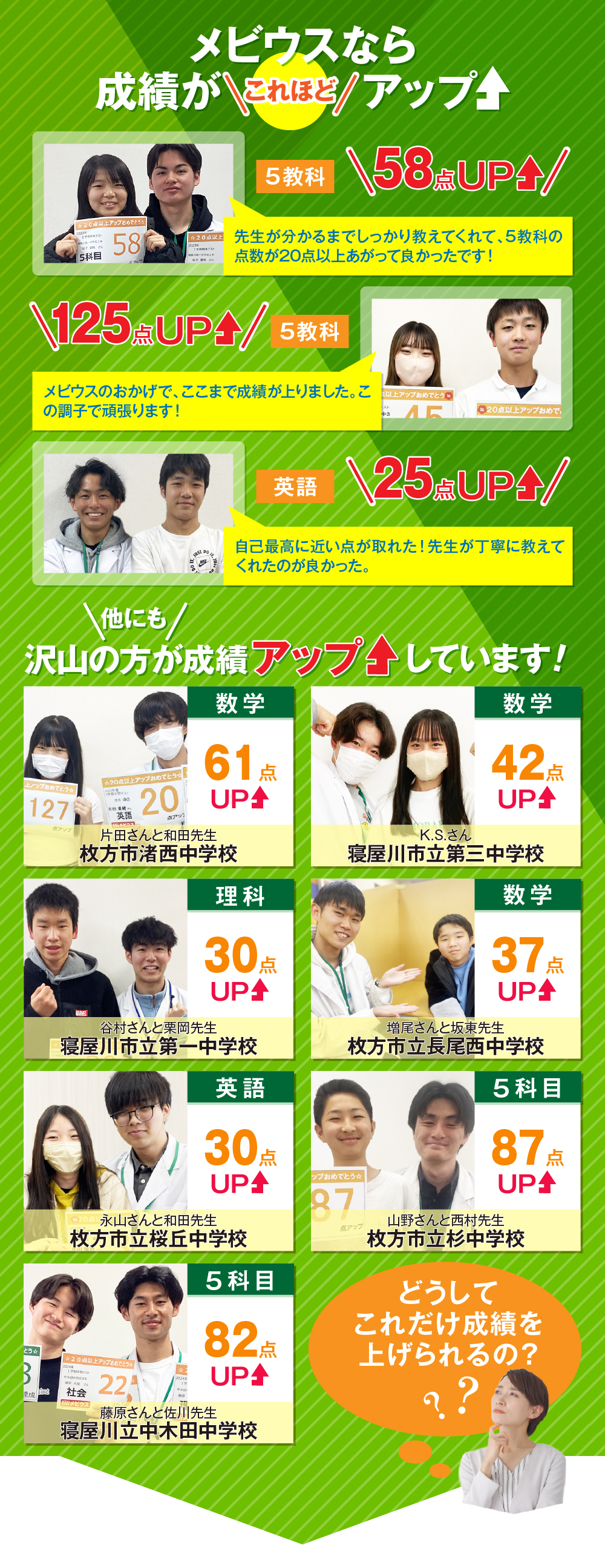 メビウスは、「先生1人に生徒2人まで」の個別指導で、「1科目+20点の成績保証」が大評判の塾です。しかも、「保護者様にも安心の授業料」で、多くの保護者様からご好評いただいております。