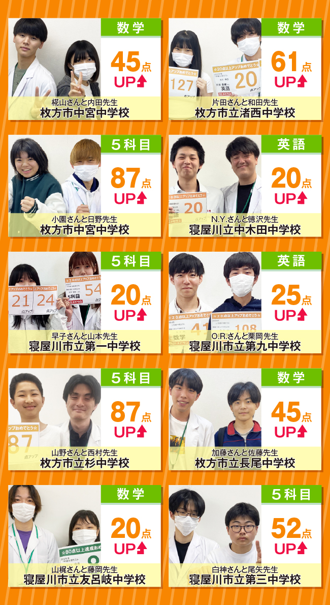 小学生:算数、国語、英語(英検) 中学生:数学、英語、国語、理科、社会 高校生:数学、英語、理科(物理・化学・生物)、地理歴史 |
