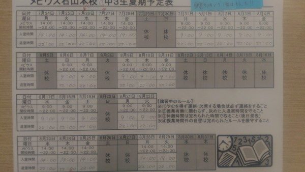 そこで中学3年生にはあらかじめ夏期講習中のメビウスへの「入室時間」「退室時間」の予定表を書いてもらっております。
