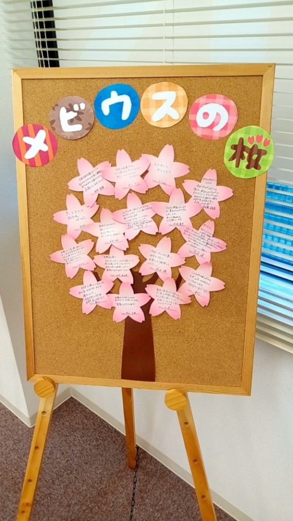 石山本校では受験生に向けて応援メッセージの「メビウスの桜」を掲示中です。